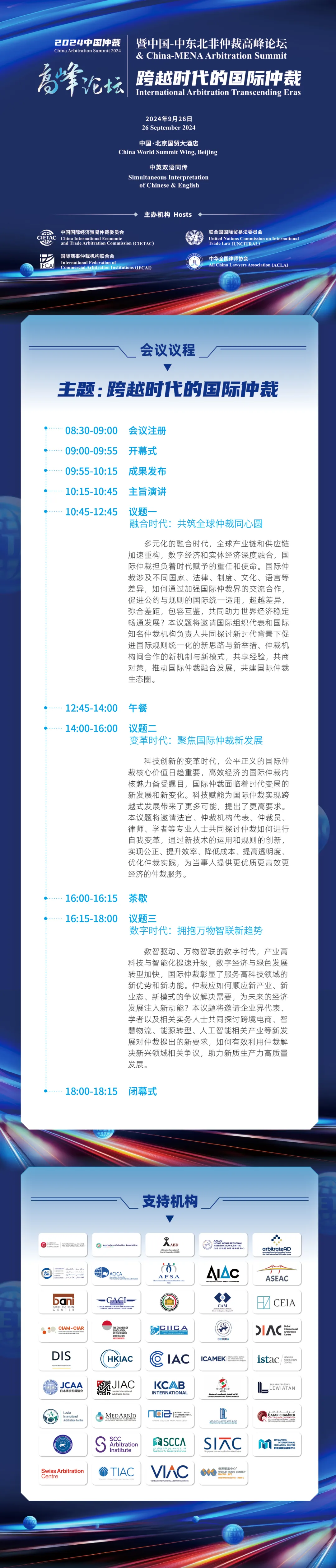 由中国国际经济贸易仲裁委员会(CIETAC),联合国国际贸易法委员会(UNCITRAL) 星辰影院,国际商事仲裁机构联合会(IFCAI)以及中华全国律师协会(ACLA)联合举办的2024中国仲裁高峰论坛暨中国-中东北非仲裁高峰论坛将于2024年9月26日在北京国贸大酒店举办。